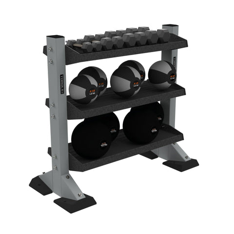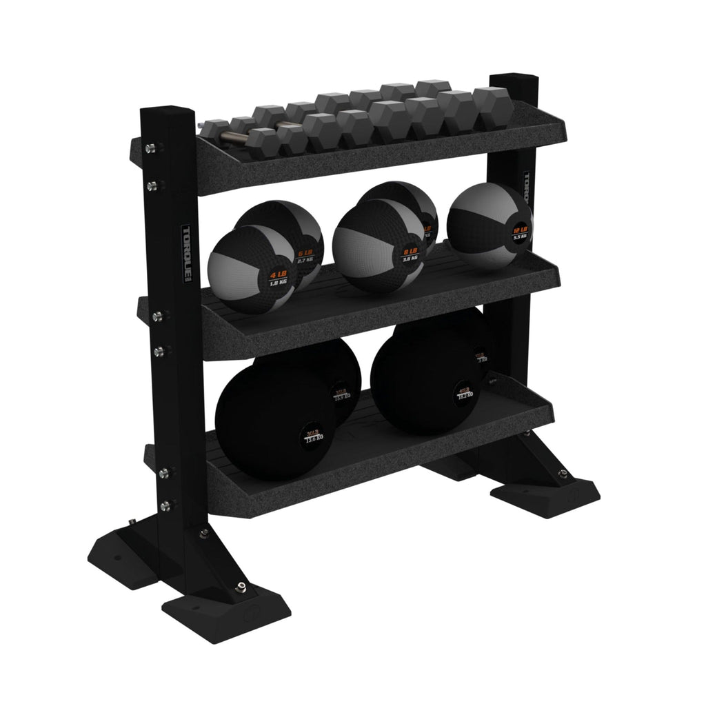 Storage shelves can be accessed from either side so this unit can be placed against a wall or in a central area. These accessory shelving trays can be mounted flat or angled down at 15 degrees for ergonomic placement and retrieval of dumbbells.