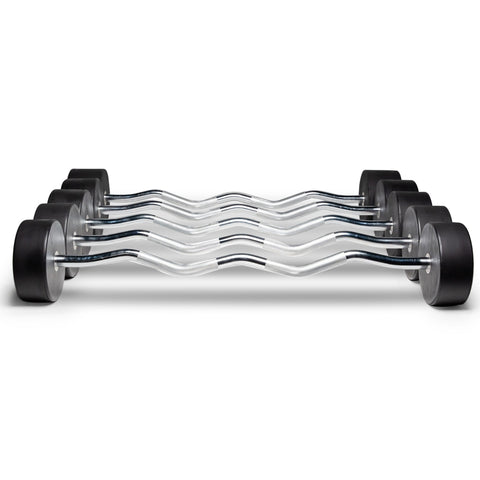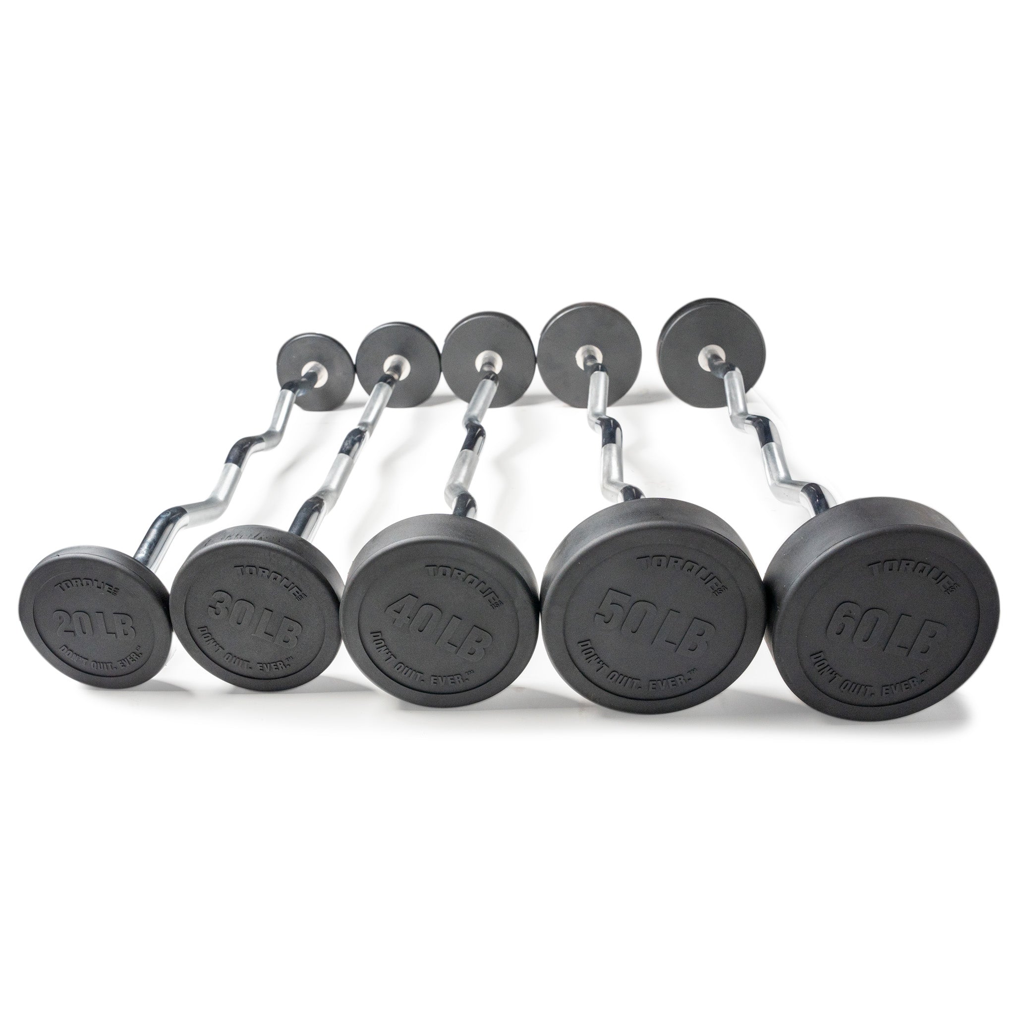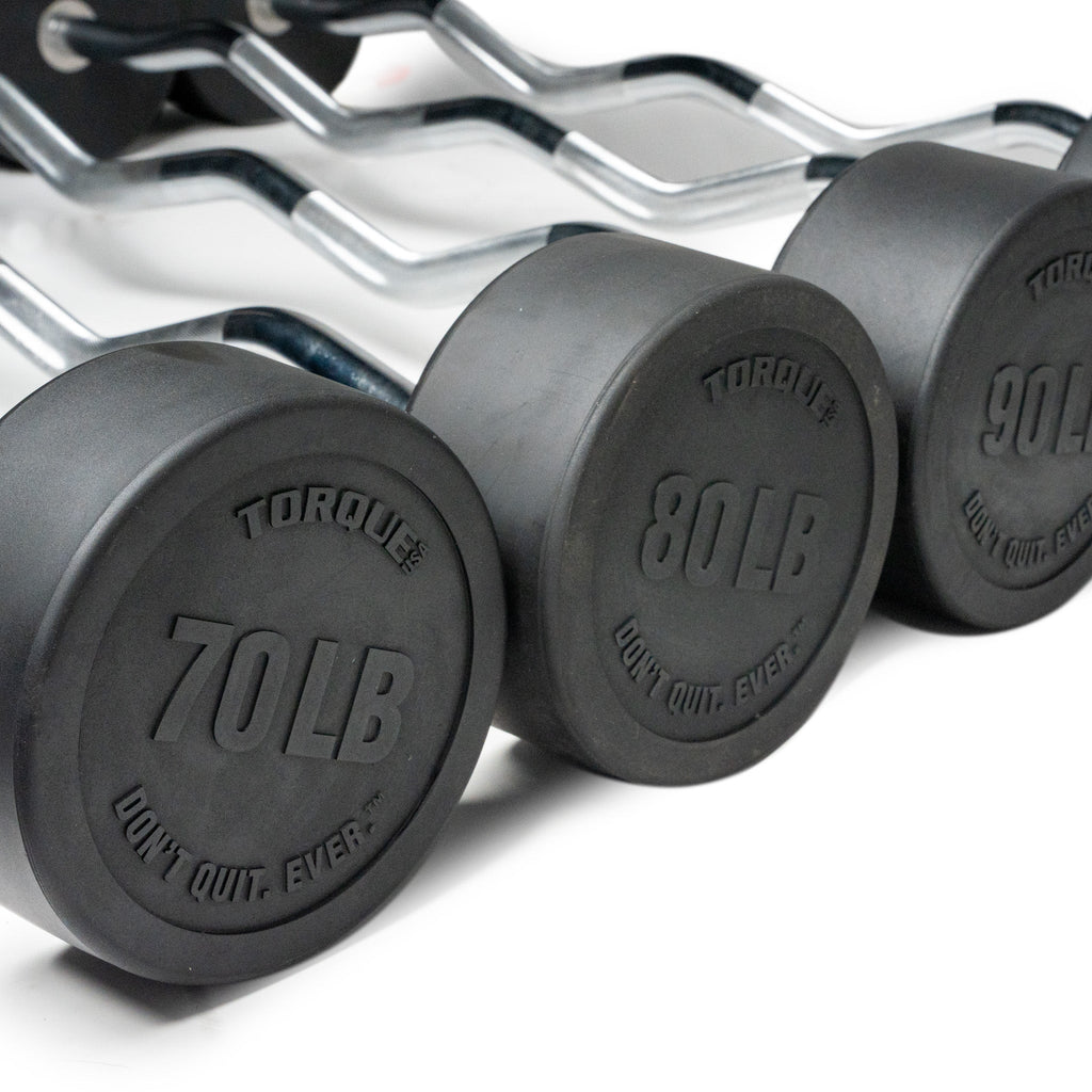 Convenient and versatile, Torque’s pro-style EZ curl fixed weight barbell family is an excellent addition to any facility, large or small. With durable rubber heads, these barbells are a great tool for all types of movements and are designed with longevity in mind. Sold in sets of 20-60lbs and 70-110lbs, or individually, the bars are designed to fit perfectly on a standard barbell rack. Check out what Torque has to offer for accompanying racks and storage here.