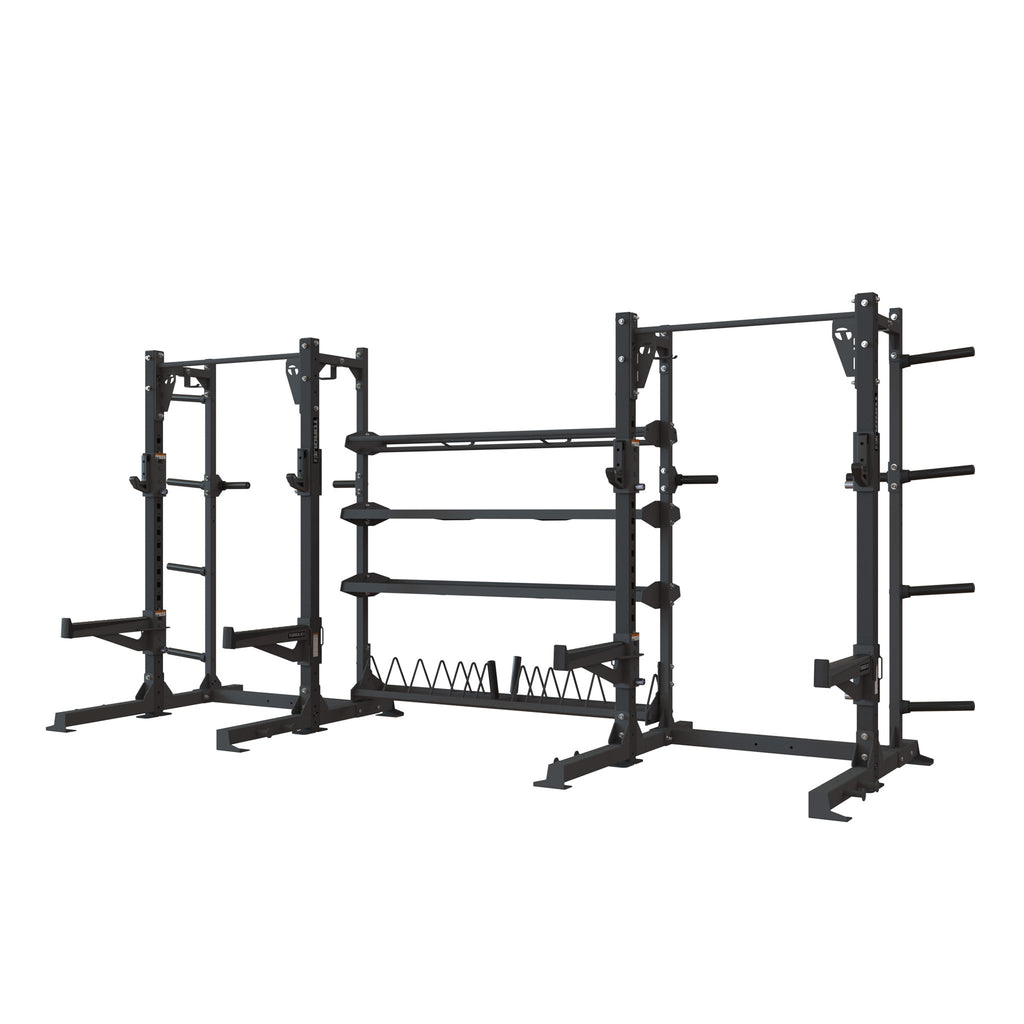 The TR1 double half rack with storage provides versatile, multi-athlete training and storage functionality where floor and ceiling space may be limited. Featuring a secure and stable footing with its 3x3” gusseted rack bases and optional anchor locations for floor mounting, this double half rack configuration is joined together by our X-CREATE 6' storage options to hold a variety of accessories.