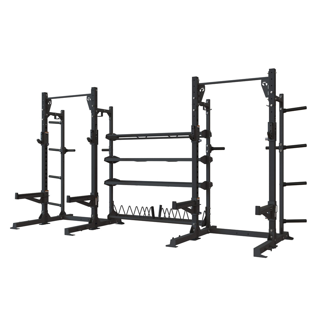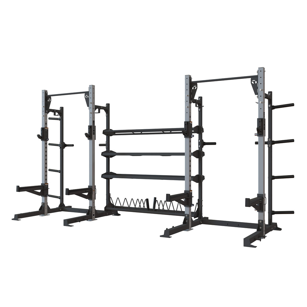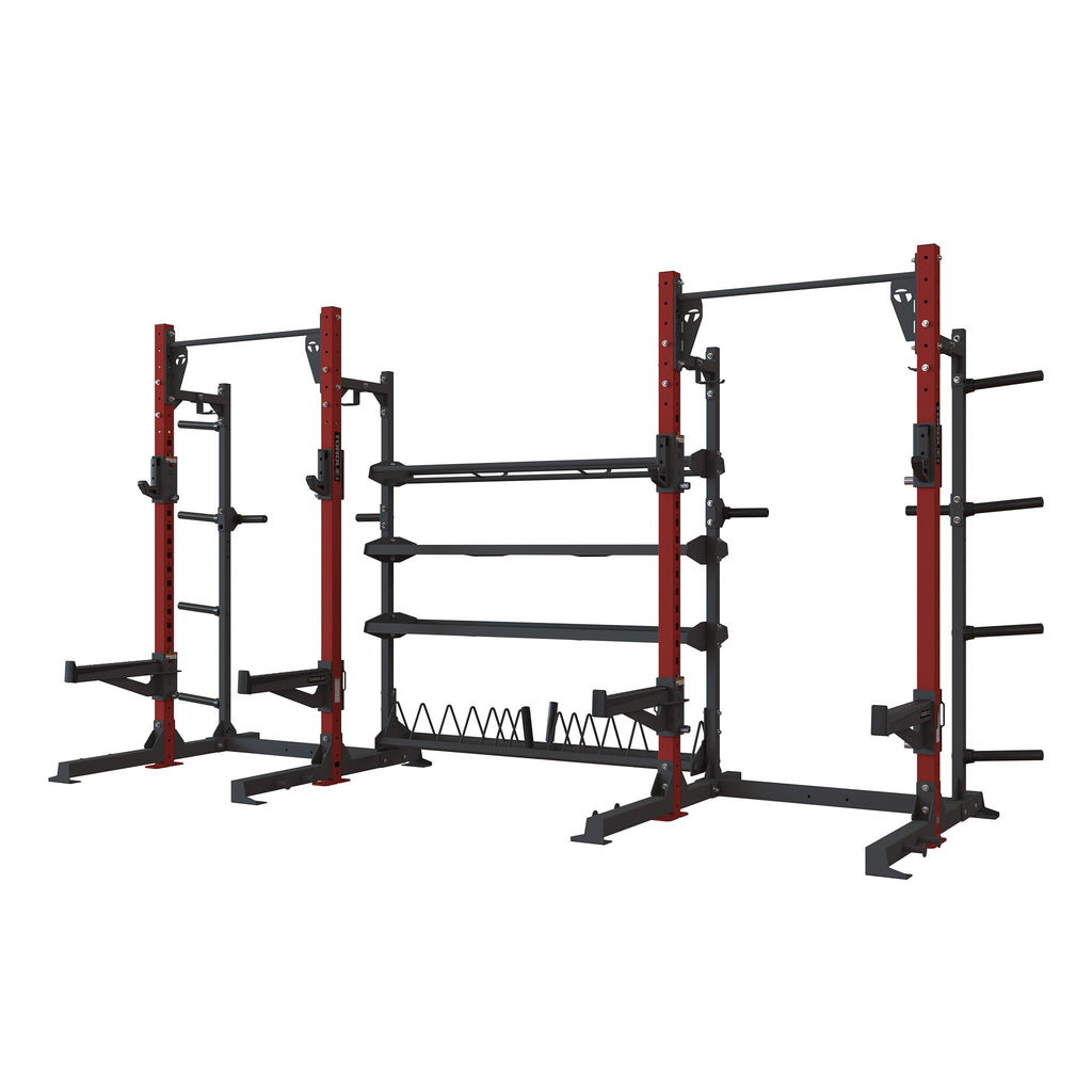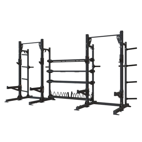 The TR1 double half rack with storage provides versatile, multi-athlete training and storage functionality where floor space may be limited. Featuring a secure and stable footing with its 3x3” gusseted rack bases and optional anchor locations for floor mounting, this double half rack configuration is joined together by our X-CREATE 6' storage options to hold a variety of accessories.