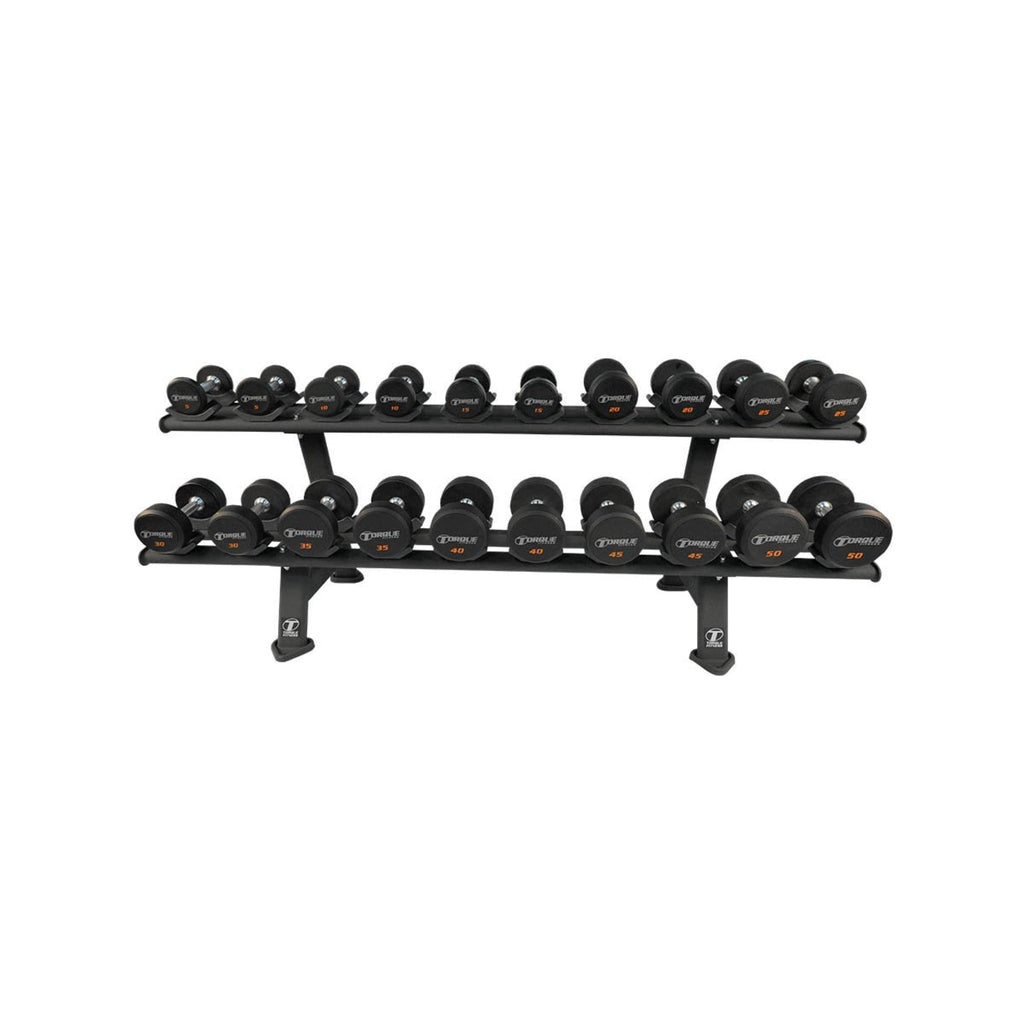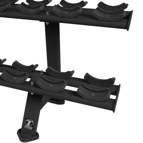 - Angled trays and offset trays for proper body position and wrist angle when racking dumbbells