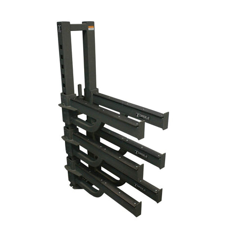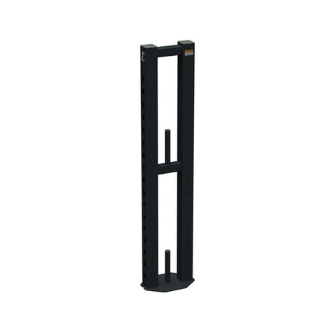 The XVASR Vertical Accessory Storage Rack stores X-RACK and X-CAGE accessories when not in use. The floor mounted station can hold up to four sets of bar catches or three sets of bar catches plus XDSA attachments. Pegs also hold Olympic collars.