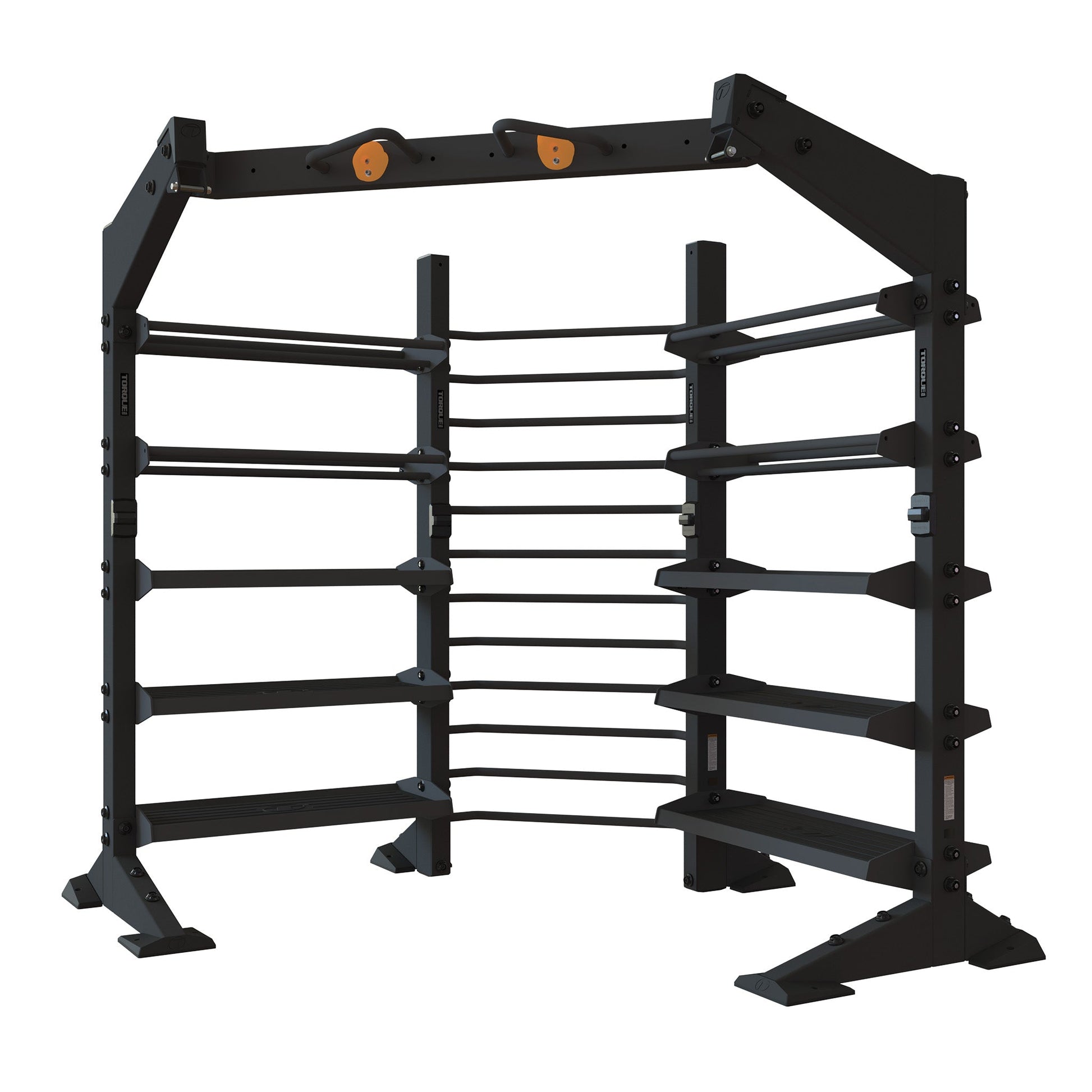 The X-CREATE Corner Storage Stall Bar Package is a space-saving solution to maximize functional training. This innovative X-CREATE package includes a line of stall bars at the center to use for a variety of suspension and bodyweight exercises. It is also outfitted with multiple accessory trays for plenty of storage space. Additionally, this system comes with a corner pull-up cross (XCREATE-CPUX-101). X-CREATE can be further customized to fit your specific needs with our large offering of add-ons. Choose between Platinum and Satin Black color options and see your facility come to life with this unique training system designed to fit in tight corners!